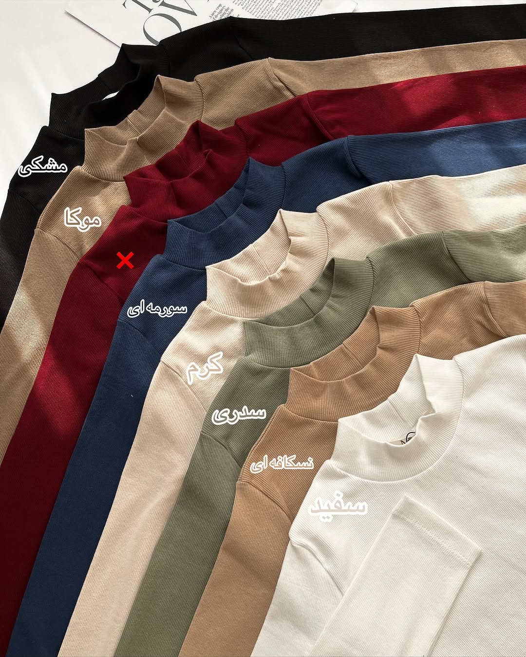 زرشکی ,سبز ,سفید ,سورمه ای ,طوسی تیره ,طوسی روشن ,قهوه ای ,کرم روشن ,مشکی |